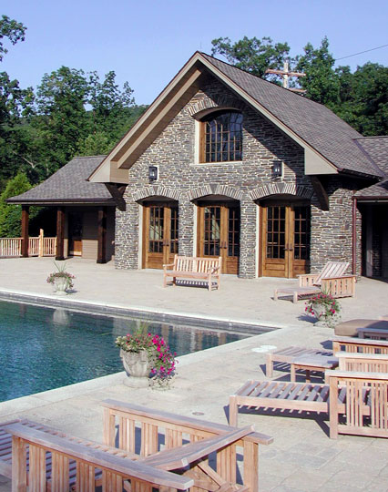 Our job was to create a new, expanded, upscale family retreat while preserving the character of the original building. Also included in the project were the pool house and garages shown. The result was a home that combined quality, comfort, and respect for the site and family origins of the house in equal measure.
